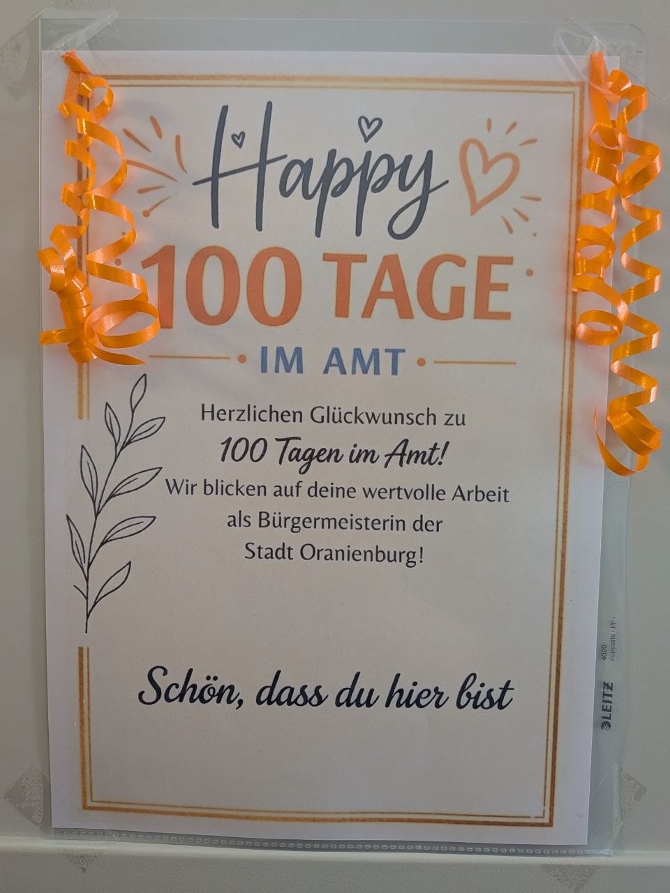 Ein Jubiläum feierte in dieser Woche Oranienburgs Bürgermeisterin Jennifer Collin-Feeder (SPD) – sie passierte die 100-Tage-Marke. Dieser erste Meilenstein muss in der Regel herhalten für eine erste kleine Mini-Bilanz. Und wir finden, die Bürgermeisterin hat erste sichtbare Veränderungen angeschoben: Verwaltungsteam neu strukturiert, das Thema Feuerwehr zur Chefinnensache gemacht, Bürgersprechstunden eingeführt und damit den direkten Draht zu den Menschen gesucht. Diese Woche fand in Lehnitz eine gut besuchte Bürgersprechstunde in Lehnitz statt, zusammen mit Ortsvorsteher Matthias Hennig. Und wie man aus dem Schloss hört, auch die Mitarbeiterinnen und Mitarbeiter finden, dass Collin-Feeder ihre Sache gut macht und haben ihr deshalb auch gratuliert. Was für eine schöne Anerkennung!