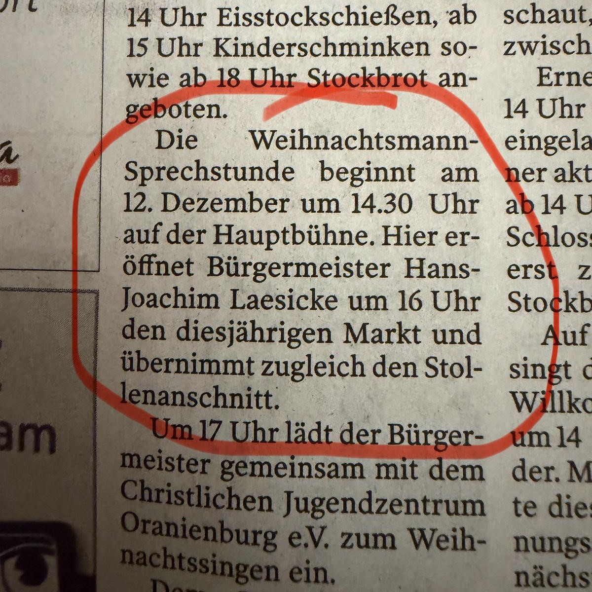 Aber Moment mal – als wir die letzte Ausgabe des Märker in die Hand nahmen, mussten wir doch zweimal hinschauen: Da stand doch glatt, dass Bürgermeister Hans-Joachim Laesicke den Stollen anschneidet! Uhm, kleiner Fehler: Der gute Herr Laesicke ist schon seit acht Jahren nicht mehr im Amt. Da scheint der Redaktion wohl der Stollen aus der Hand gefallen zu sein. Oder wollten sie einfach die Amtsjahre seines Nachfolgers eleganter ausblenden? Wir wollen ja nichts unterstellen, aber vielleicht ein kleiner Tipp: Ab nächstem Jahr einfach „Frau Bürgermeisterin“ anstelle von „Herr Bürgermeister“ – so geht’s auch!