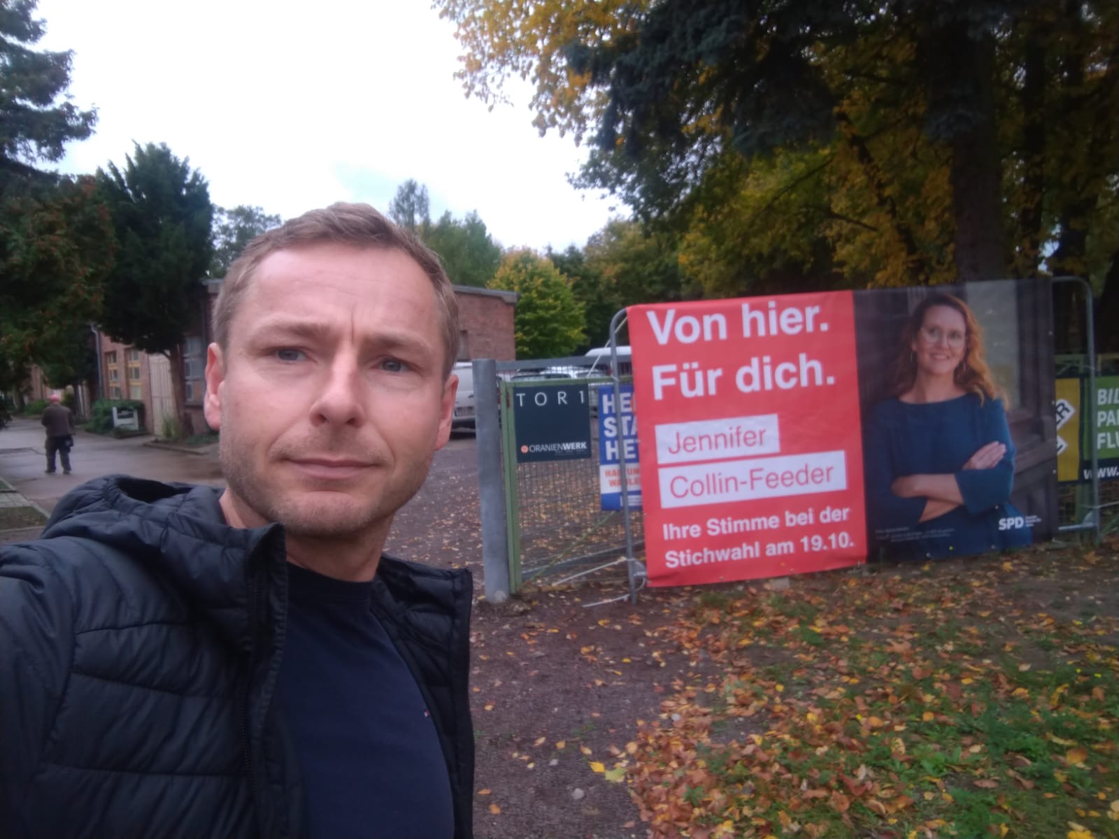 In dieser Woche haben die Unterstützerinnen und Unterstützer der SPD-Bürgermeisterkandidatin Jennifer Collin-Feeder (SPD) nochmal alles gegeben. Plakate wurden mit dem Hinweis zur Stichwahl überklebt, Infobroschüren wurden verteilt, Informationsstände aufgebaut. Max Heiduk von den Grünen macht mit der Kandidatin Hautürwahlkampf, der Kreisvorsitzende der SPD, Benjamin Grimm unterstützt sie beim Straßenwahlkampf, Ariane Fäscher und Romy Segler aus Hohen-Neuendorf helfen beim Flyern im Musikerviertel und in der Weißen Stadt. Kurz, die Kandidatin erhält viel Hilfe und Zustimmung.