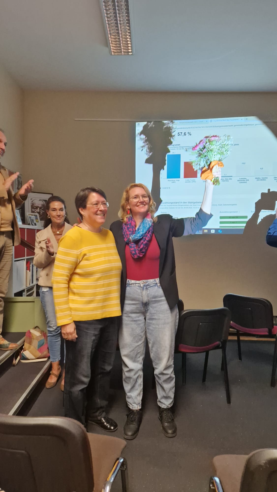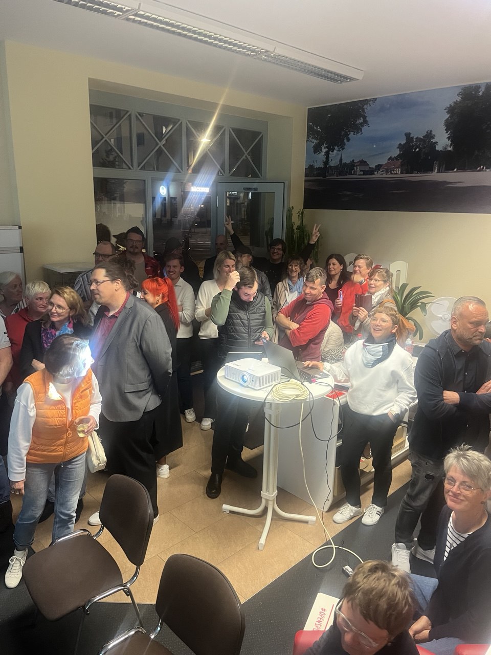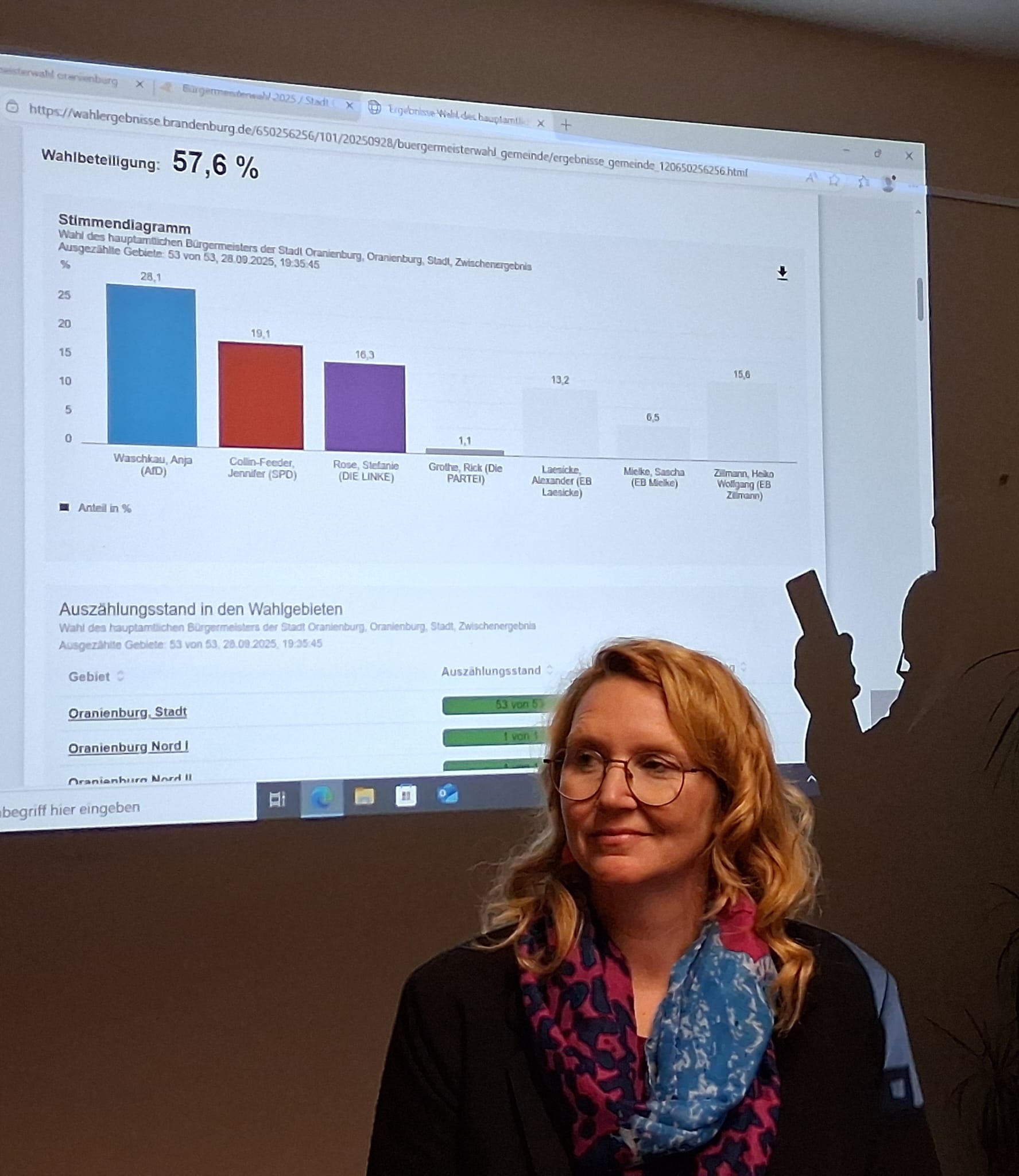 Am letzten Sonntag gab es etwas zu feiern im Bürgerbüro der SPD Oranienburg in der Bernauer Straße. Gespannt schauten die vielen Gäste auf die eingehenden Zahlen der Bürgermeisterwahlen. Je später der Abend, desto besser wurden die Zahlen der SPD-Kandidatin Jennifer Collin-Feeder, während die Zahlen der AfD-Kandidatin immer weiter runter gingen. Am Ende lag die Kandidatin der „gesichert rechtsextremen“ Partei zwar vorn, aber nicht so, wie die sich das vorgestellt hatten. Und jetzt geht es in die zweite Runde, da keine Kandidatin über 50% der abgegebenen Stimmen erhalten hat. Die beide Frauen treten in der Stichwahl gegeneinander an.