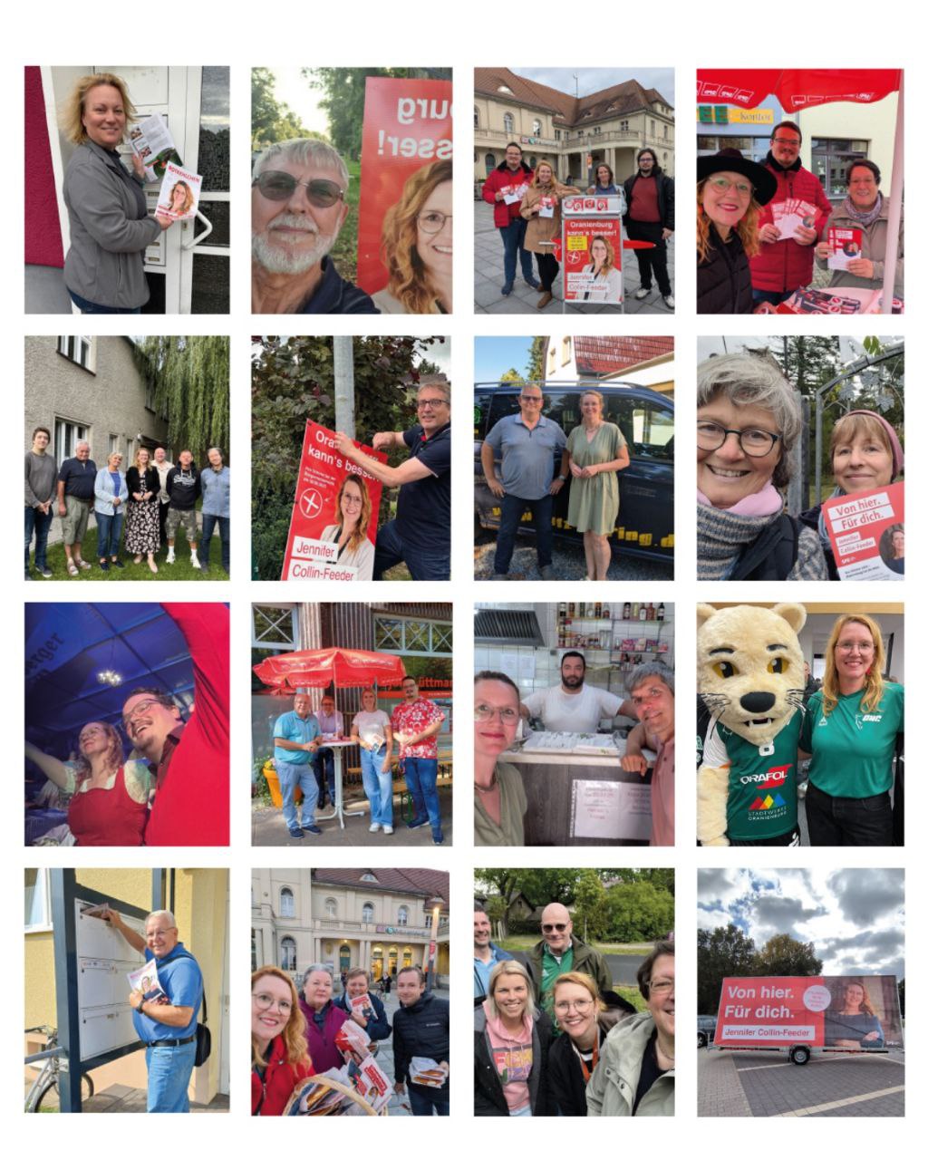 Zwischen den vielen Terminen nimmt Jennifer Collin-Feeder kurze Videos für ihre Social Media Kanäle auf, um den Oranienburgerinnen und Oranienburgern Einblicke in ihren Wahlkampf zu geben. Auch einige der vielen Unterstützerinnen und Unterstützer senden Videobotschaften – darunter sind der Ortvorsteher aus Sachsenhausen Burkhard Wilde, die stellvertretende Landesvorsitzende der brandenburgischen SPD Ines Hübner oder SPD-Landtagsabgeordnete wie Dr. Benjamin Grimm, Björn Lüttmann oder Dr. Manja Schüle. Auch der langjährige Stadtverordnete in der Stadtverordnetenversammlung Oranienburg Dirk Blettermann ließ es sich nicht nehmen, in einem Video für die Wahl von Jennifer Collin-Feeder zu werben. Allen ist klar: Oranienburg kann´s besser – mit JENNIFER COLLIN-FEEDER.
