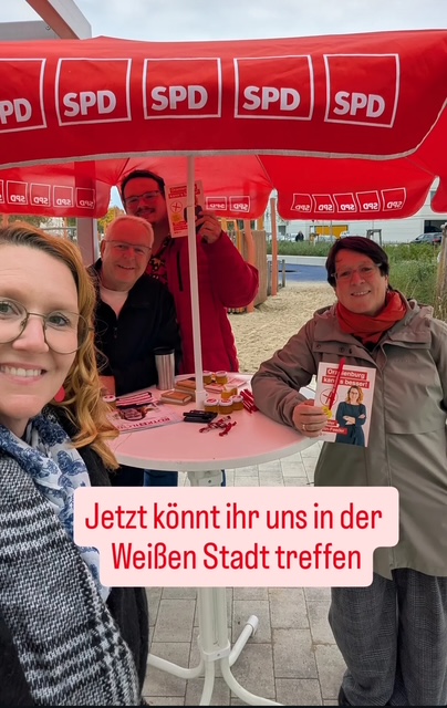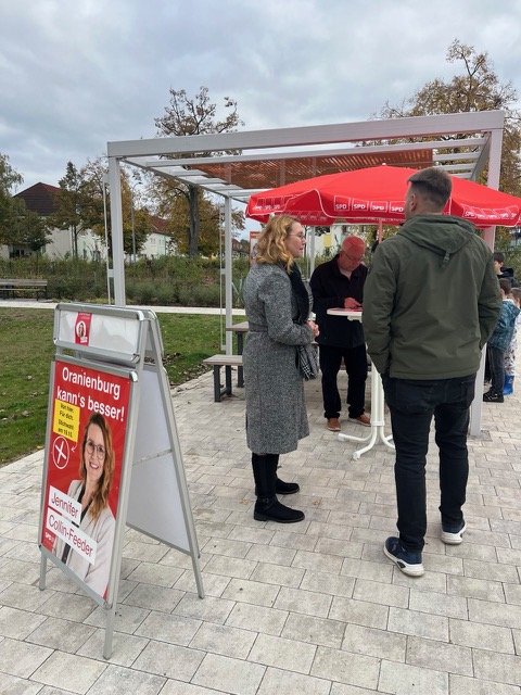 Parallel haben die Mitglieder der SPD sich auf Einladung von Marei John-Ohnesorg im TURM getroffen. Es gab viel Zuspruch, die Motivation ist riesig, das Engagement ungebrochen. Wir werden in den nächsten zweieinhalb Wochen überall unterwegs sein und an allen vorstellbaren Stellen das Gespräch suchen. Bitte haben Sie bei Ihrer Wahl die Herbstferien im Blick. Briefwahl ist jetzt schon möglich. Alle nötigen Infos finden Sie auf der Website der Stadt Oranienburg. Bitte machen Sie mit uns Werbung für unsere Kandidatin Jennifer Collin-Feeder. Weil es um Oranienburg geht.