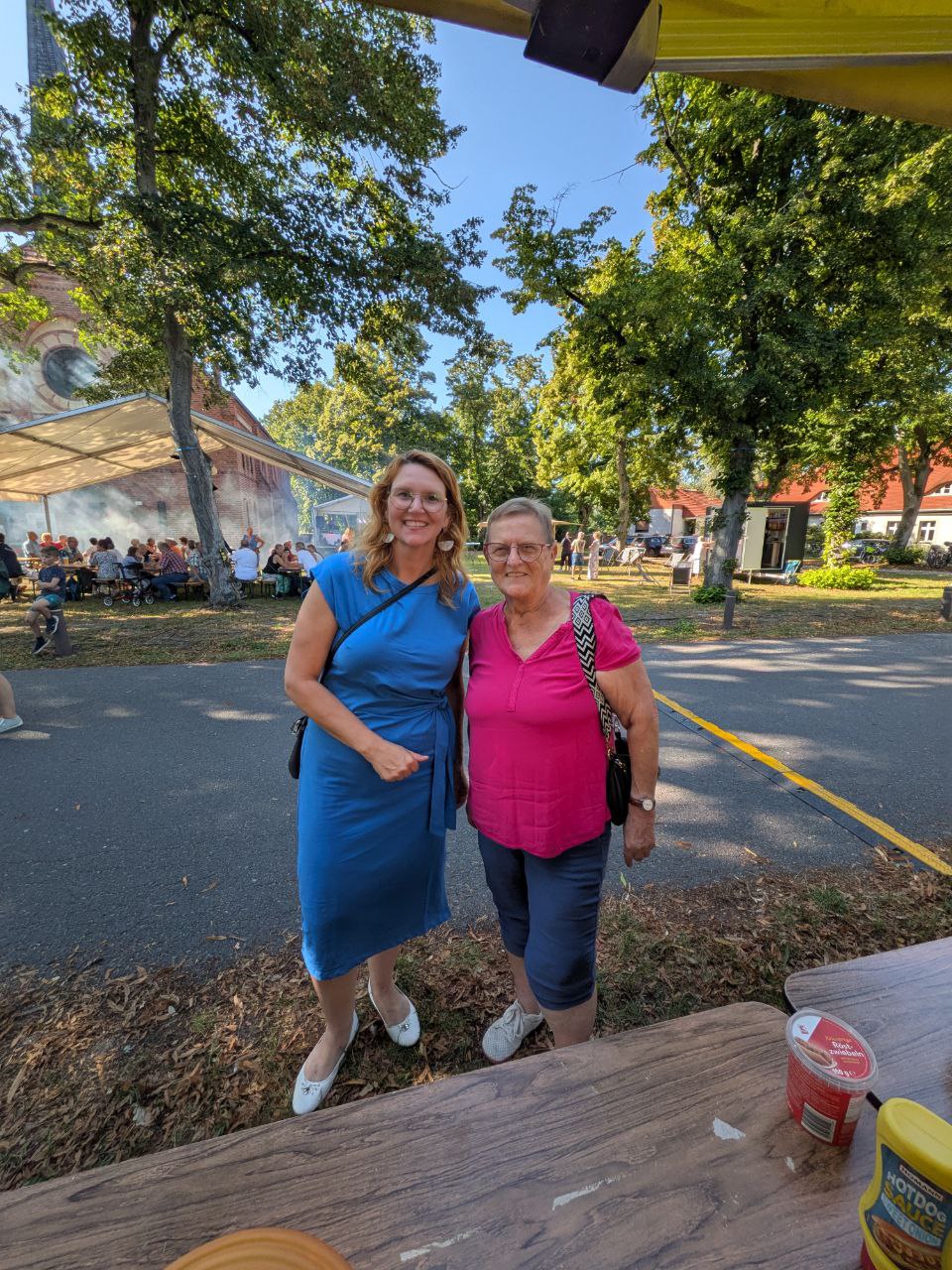 Was sonst los ist? Dorffeste, haben wir gerade erwähnt. Tür zu Tür-Besuche sind in vollem Gang. Richtig viel los war am letzten Wochenende vor dem Schloss. Der Schlosspark hat seine Türen für ein Licht und Musik-Spektakel geöffnet. Viele sind aus Oranienburg gekommen, viele auch aus dem Umland. Wir waren natürlich mittendrin mit Jennifer Collin-Feeder. Wie das aussah, konnte man auf Instagram und Facebook sehen, oder jederzeit auf YouTube. https://www.youtube.com/@spdoranienburg7831. Gern abonnieren und mit den Shorts immer auf dem Laufenden sein. Aber: Live und in Farbe ist natürlich immer am Schönsten. Darauf dürfen sich heute die Bewohnerinnen und Bewohner der Neustadt freuen. Hier ist die Kandidatin heute Nachmittag, am Freitag unterwegs, zusammen mit der Ortsvereinsvorsitzenden Marei John-Ohnesorg.