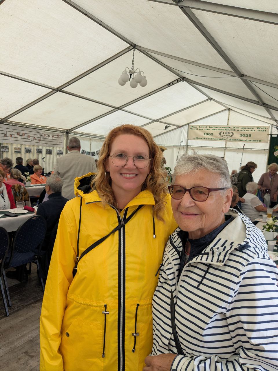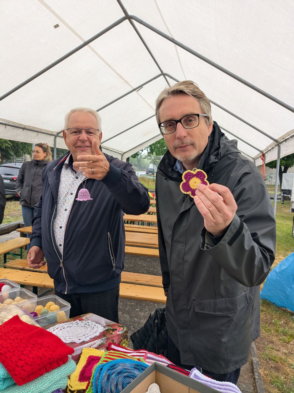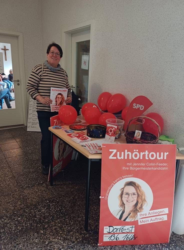 Als Bürgermeisterkandidatin war Jennifer Collin-Feeder am Wochenende bei den Dorffesten in Sachsenhausen und Malz unterwegs – zwei tolle Veranstaltungen, bei denen das Wetter der Stimmung keinen Abbruch tat! In Sachsenhausen wurde im Festzelt gefeiert – u.a. 120 Jahre Quartettfreunde Sachsenhausen und viele weitere Chöre sorgten für musikalische Highlights. Ortsvorsteher Burkhard Wilde (Pro Sachsenhausen/SPD) ließ es sich nicht nehmen der Kandidatin auch das künftige Bürgerhaus zu zeigen. In Malz gab’s deftiges Kassler, Soljanka, Musik und für die Hartgesottenen ein paar Trödelstände und selbstgehäkelte, kleine Kunstwerke. Der dortige Ortsvorsteher Michael Richter (SPD) war über den Besuch der Kandidatin und des Oranienburger Landtagsabgeordneten Björn Lüttmann hoch erfreut.