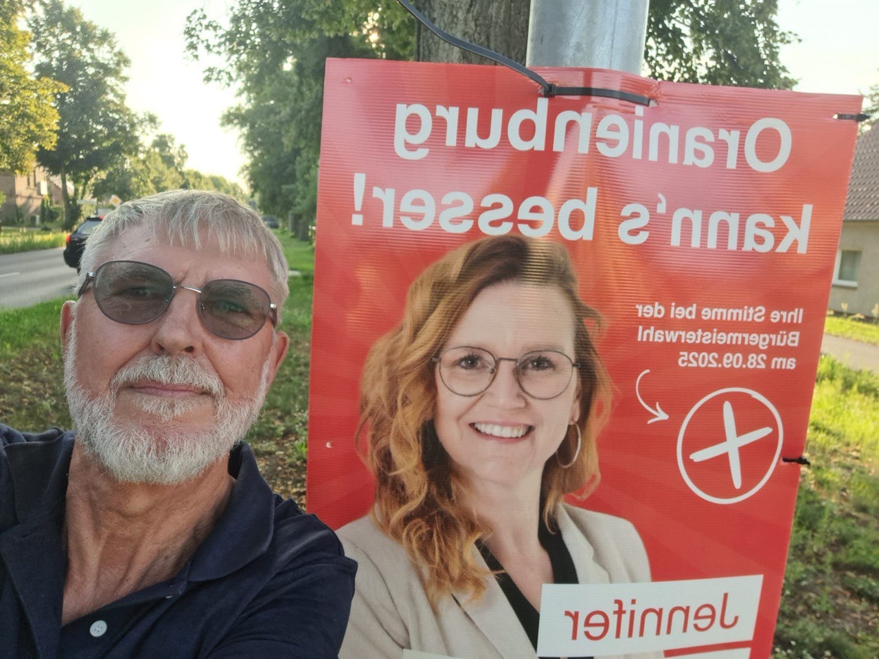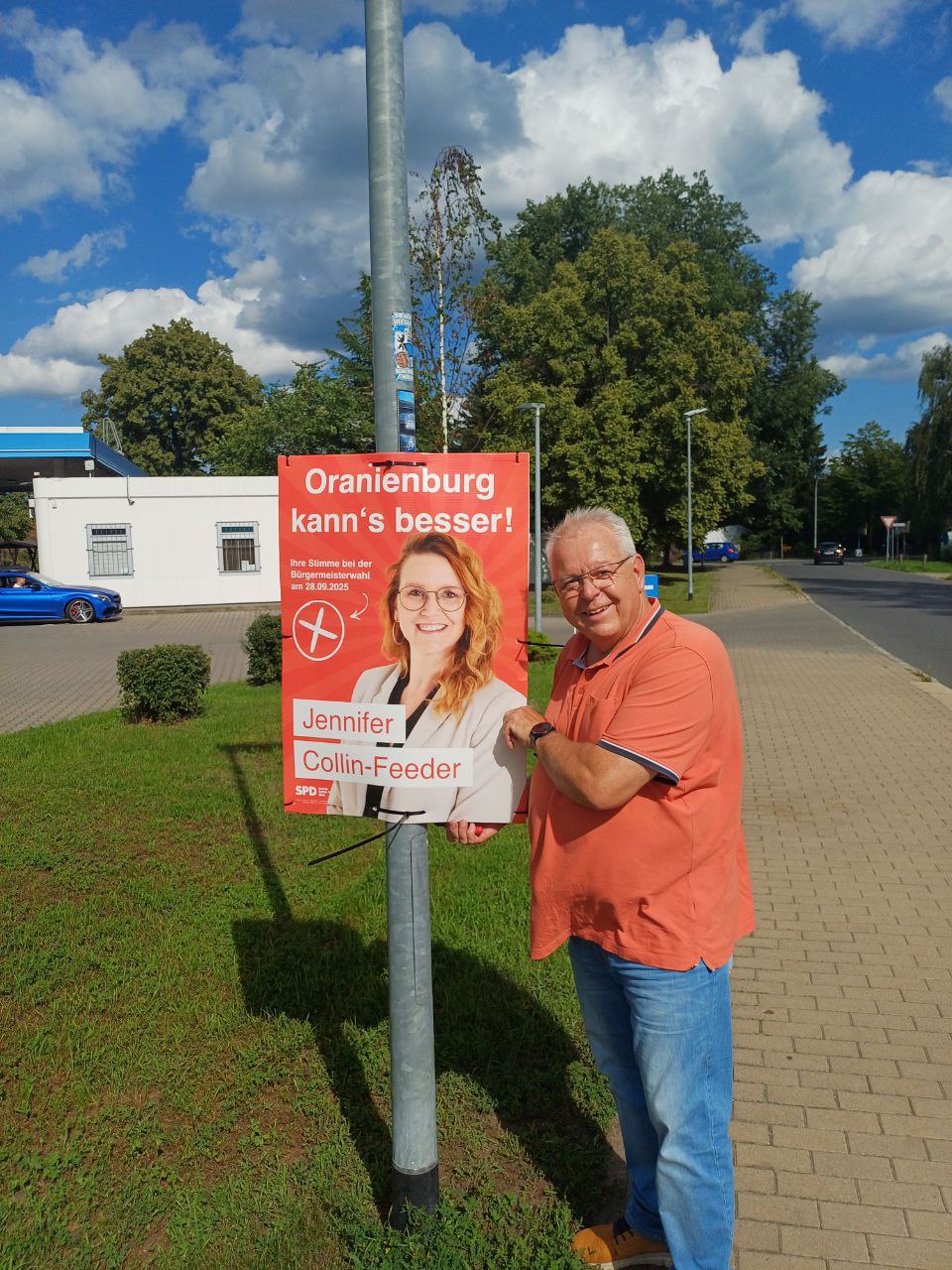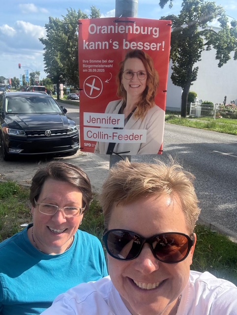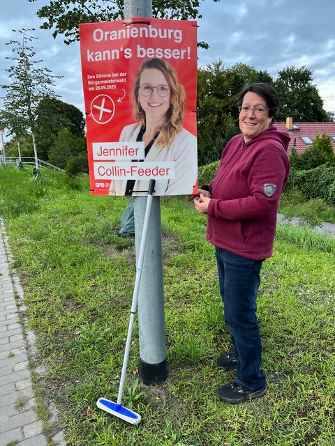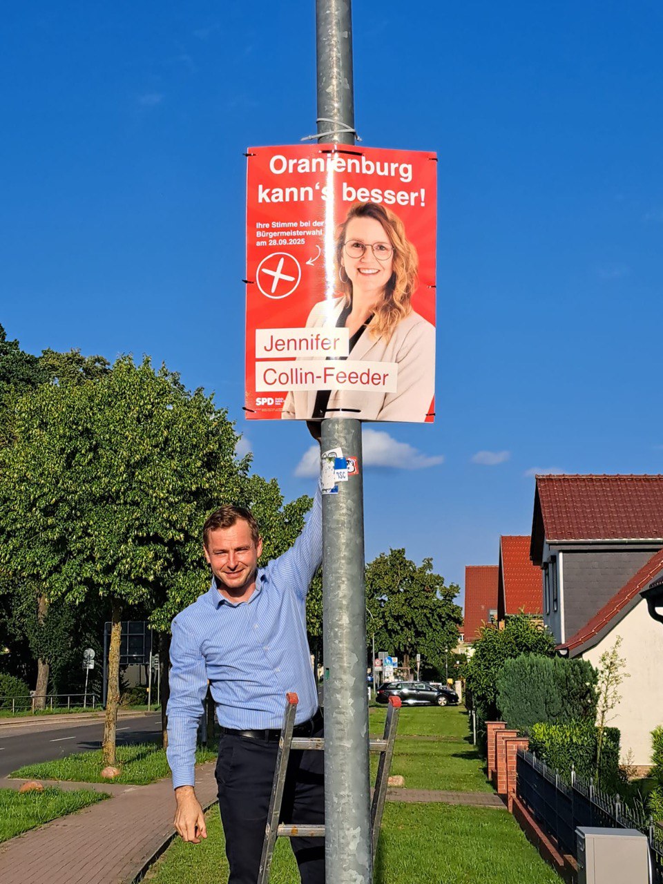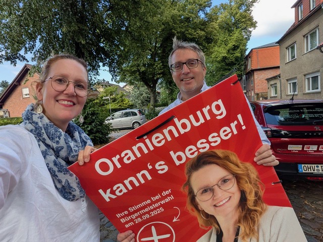 Seit letztem Montag hängen nun wieder die Wahlplakate. Am 28. September 2025 findet in Oranienburg die Wahl für das Bürgermeisteramt statt. Relativ schnell haben der Amtsinhaber und die SPD-Kandidatin Jennifer Collin-Feeder ihre bildlichen Botschaften verbreitet. Aber auch in den sozialen Medien kommt der Wahlkampf in Fahrt. Für den 2. August, also morgen am Samstag, hat Jennifer Collin-Feeder ein Imagevideo angekündigt. Wir sind gespannt.
