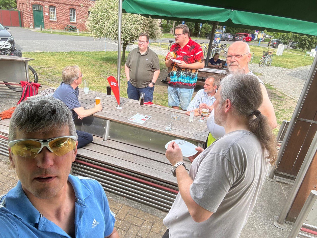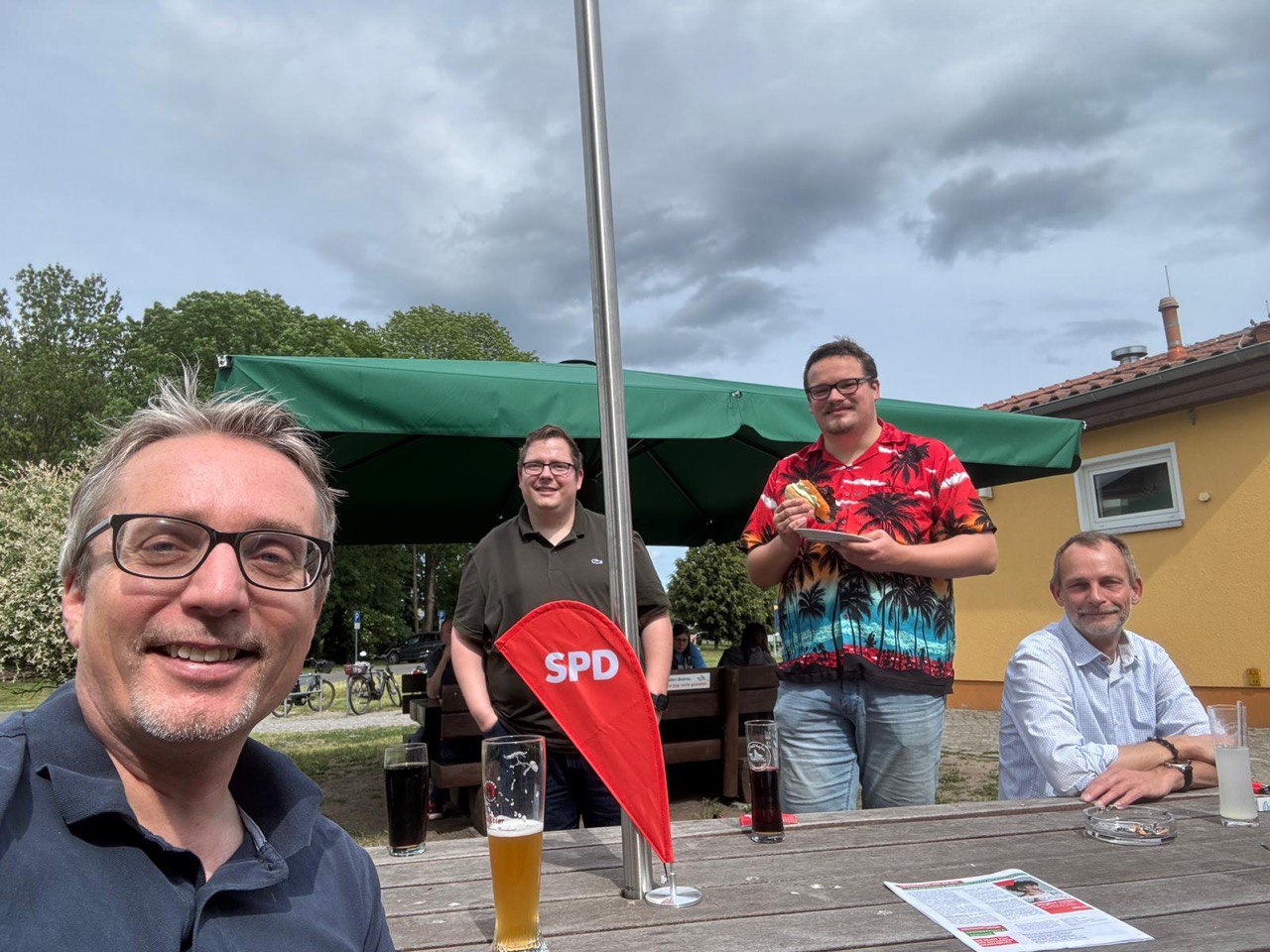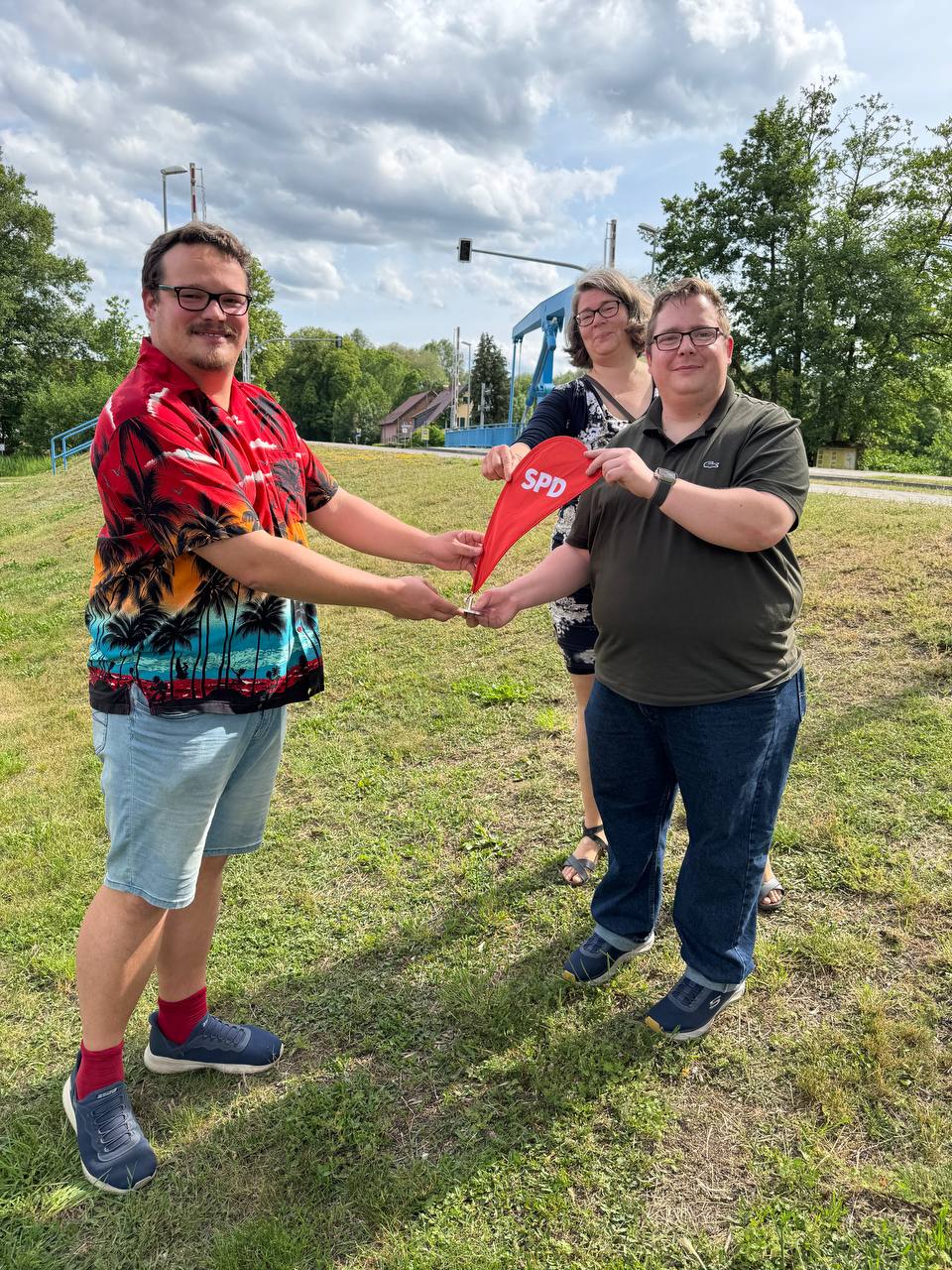 Kaum war der Regenbogen verblasst, stand am nächsten Tag Liebenwalde auf dem Plan. Dort traf sich eine gut gelaunte Sozi-Truppe am Ankerplatz – bewaffnet mit Eis, Fischbrötchen und einem offenen Ohr für die Anliegen der Bürger:innen. Zwischen Softeis und Kita-Debatte sprach unser Landtagsabgeordneter Björn Lüttmann über die Pläne der Landesregierung in Sachen Bildungslandschaft. Und als wäre das alles nicht symbolträchtig genug, wurde ein SPD-Wimpel feierlich wie ein Staffelstab für die SPD-Arbeit in Liebenwalde von Tony Sieg und Katharina Queiser an unseren stellvertretenden Vorsitzenden Gero Gewald überreicht. Parteiarbeit mit maritimer Note!