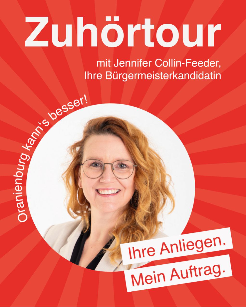 In dieser Woche hat Jennifer Collin-Feeder ihre Zuhörtour gestartet: „Unter dem Motto „Oranienburg kann’s besser!“ besuche ich Vereine, Firmen und Akteure vor Ort, um mir ein Bild von deren Herausforderungen und Ideen zu machen. Aber auch Bürgerinnen und Bürger der Stadt können mich für ein Gespräch am Küchentisch oder über den Gartenzaun einladen, um über ihre Anliegen, Sorgen und Wünsche zu sprechen. Schreibt mir einfach eine Nachricht hier über meinen Kanal“, so Oranienburgs SPD-Bürgermeisterkandidatin Jennifer Collin-Feeder.